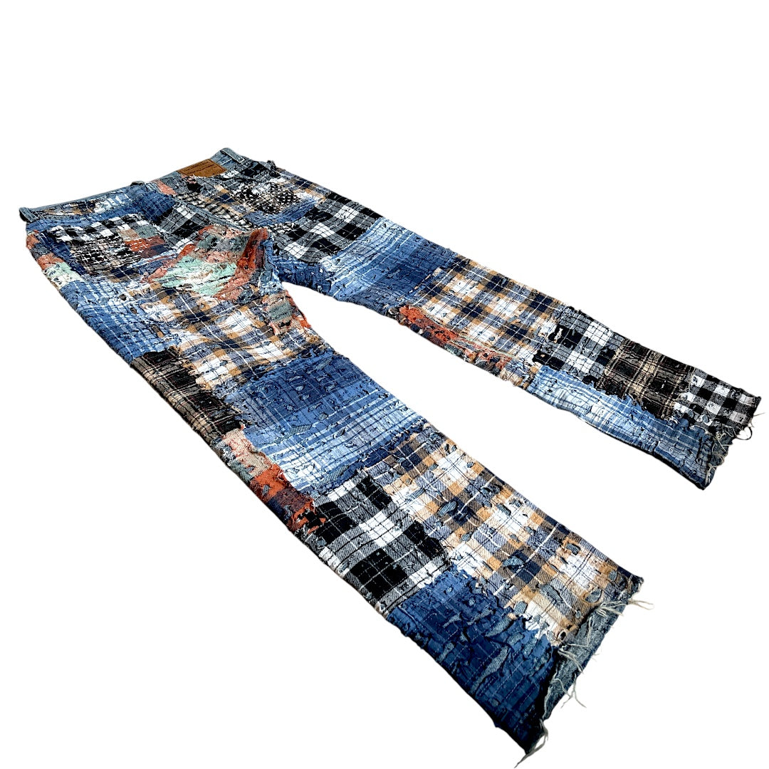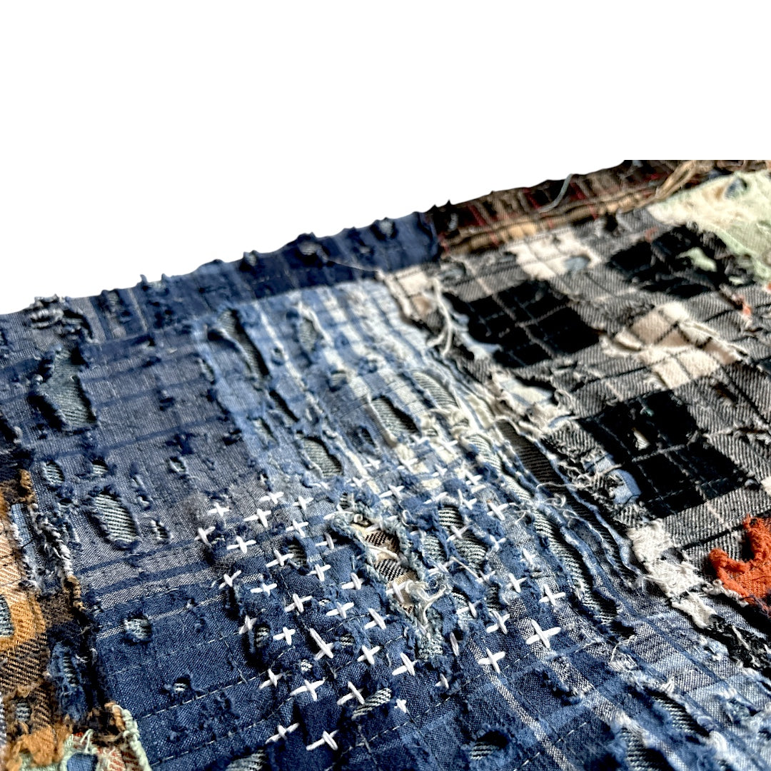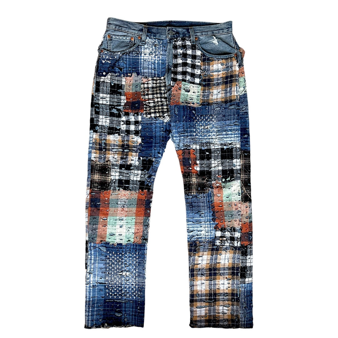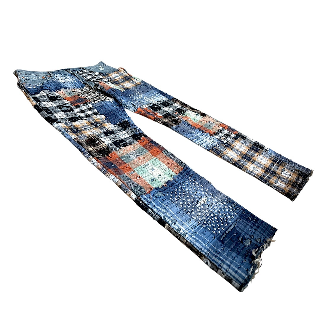 These pants started as a classic pair of Levi’s and six vintage flannel shirts. I broke them down, reworked them into patchwork panels, added distressing, and finished it all off with hand-done sashiko stitching.