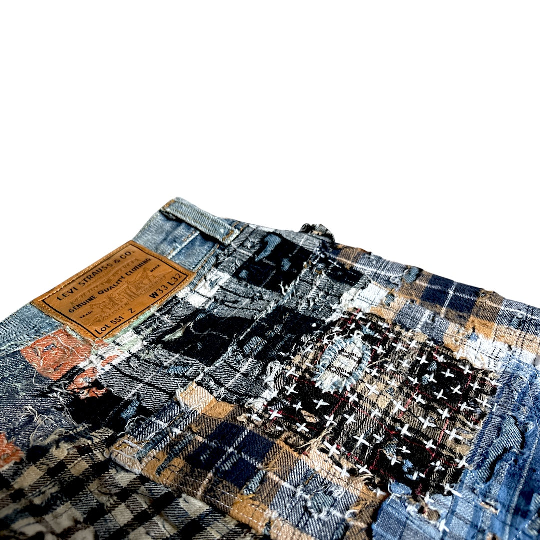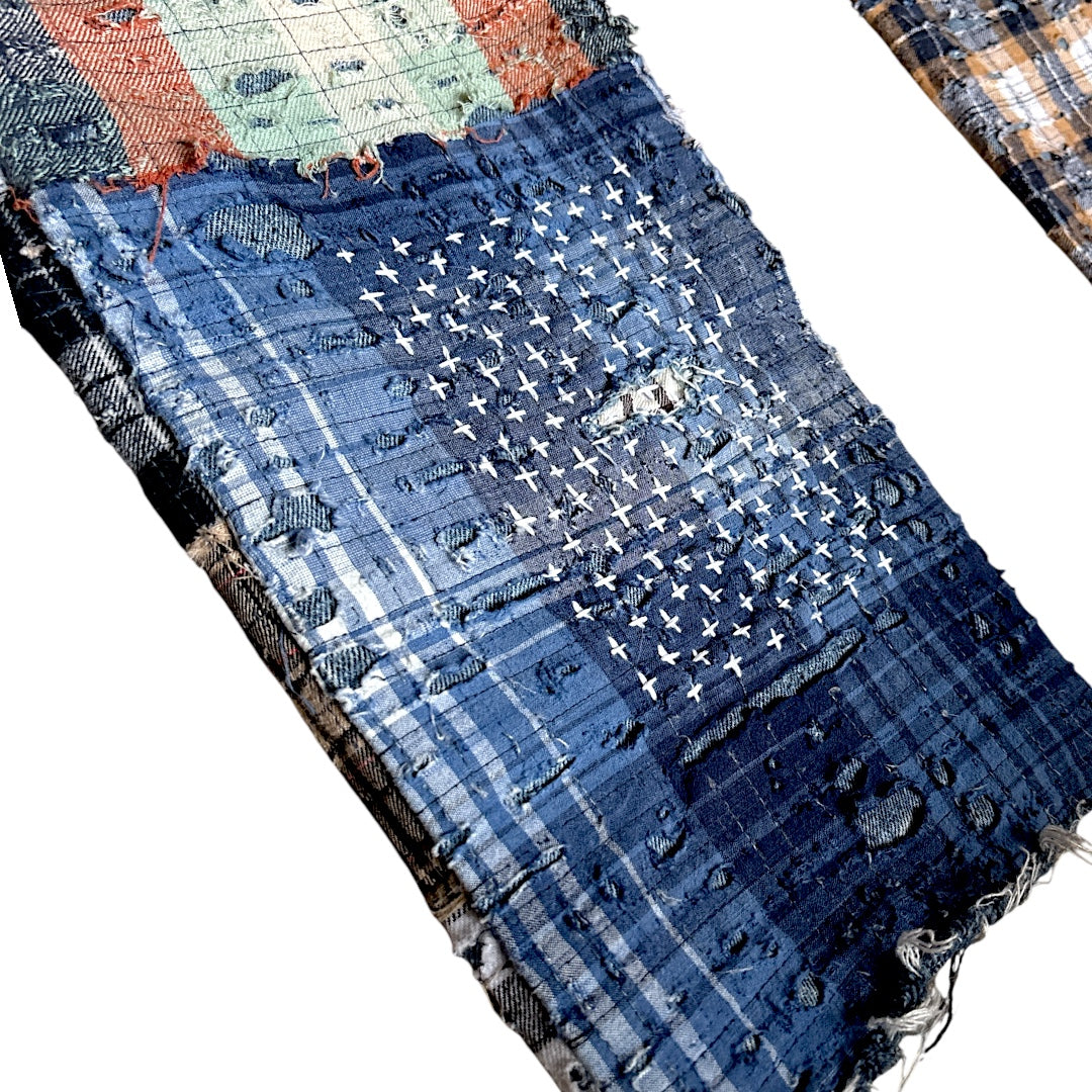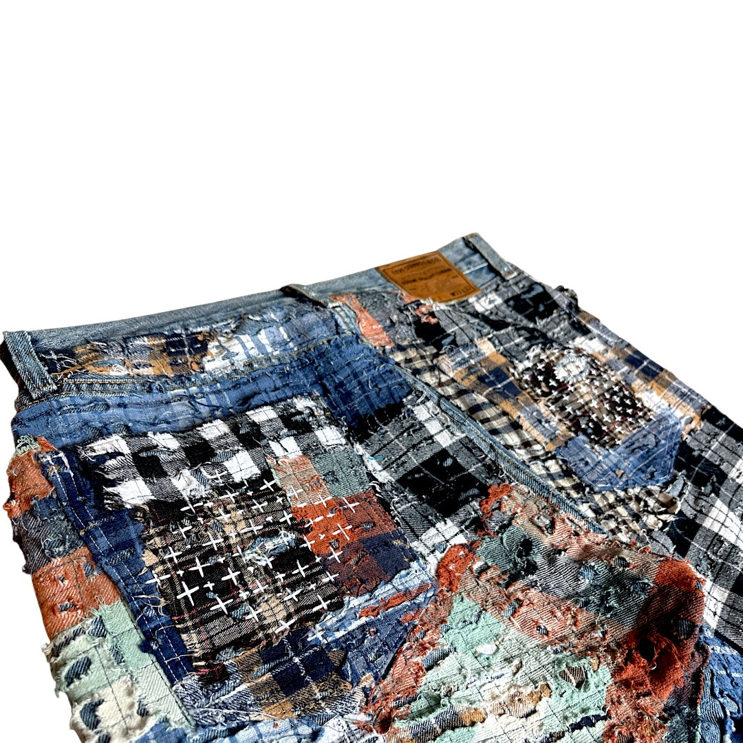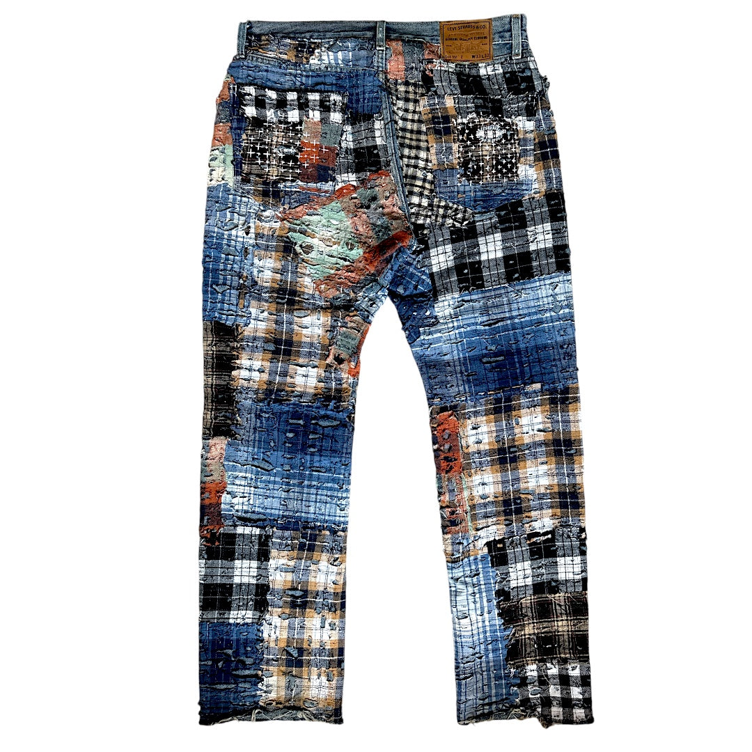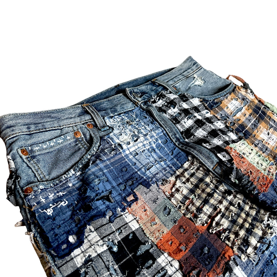 These pants started as a classic pair of Levi’s and six vintage flannel shirts. I broke them down, reworked them into patchwork panels, added distressing, and finished it all off with hand-done sashiko stitching.