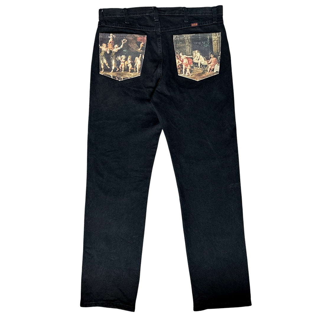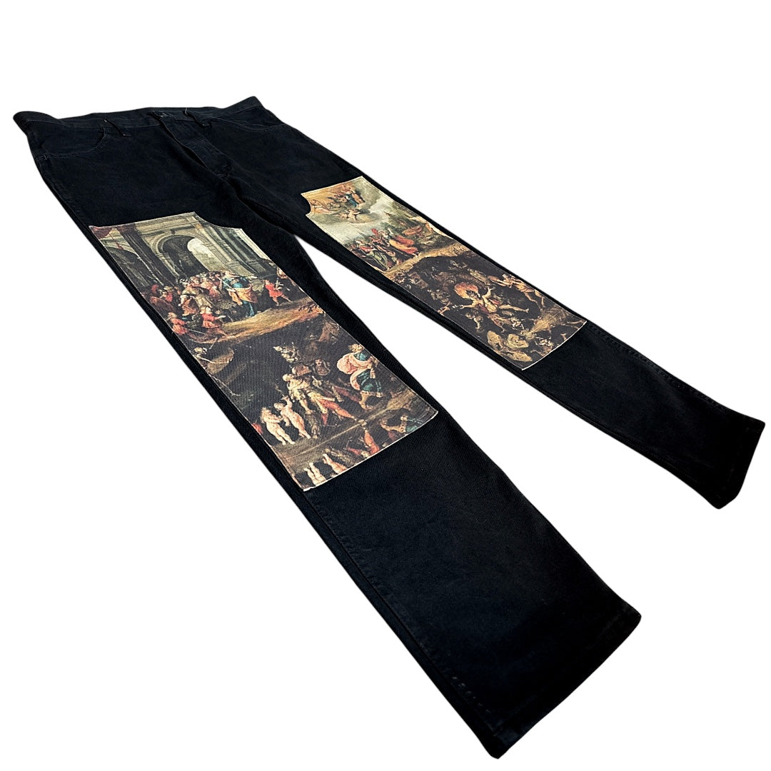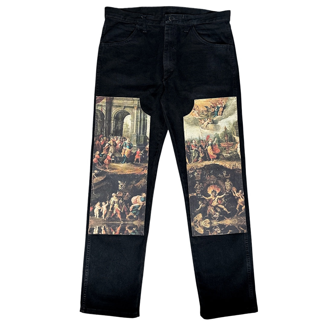 I transformed Hendrick Goltzius’ painting The Choice Between Virtue and Vice a piece about the choices we make and the life we live. Now stitched into a beautiful 1of1 pair of double-kneed jeans.