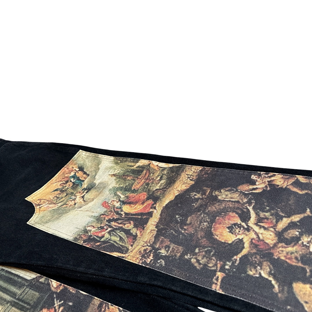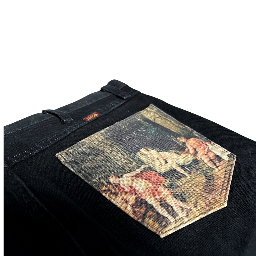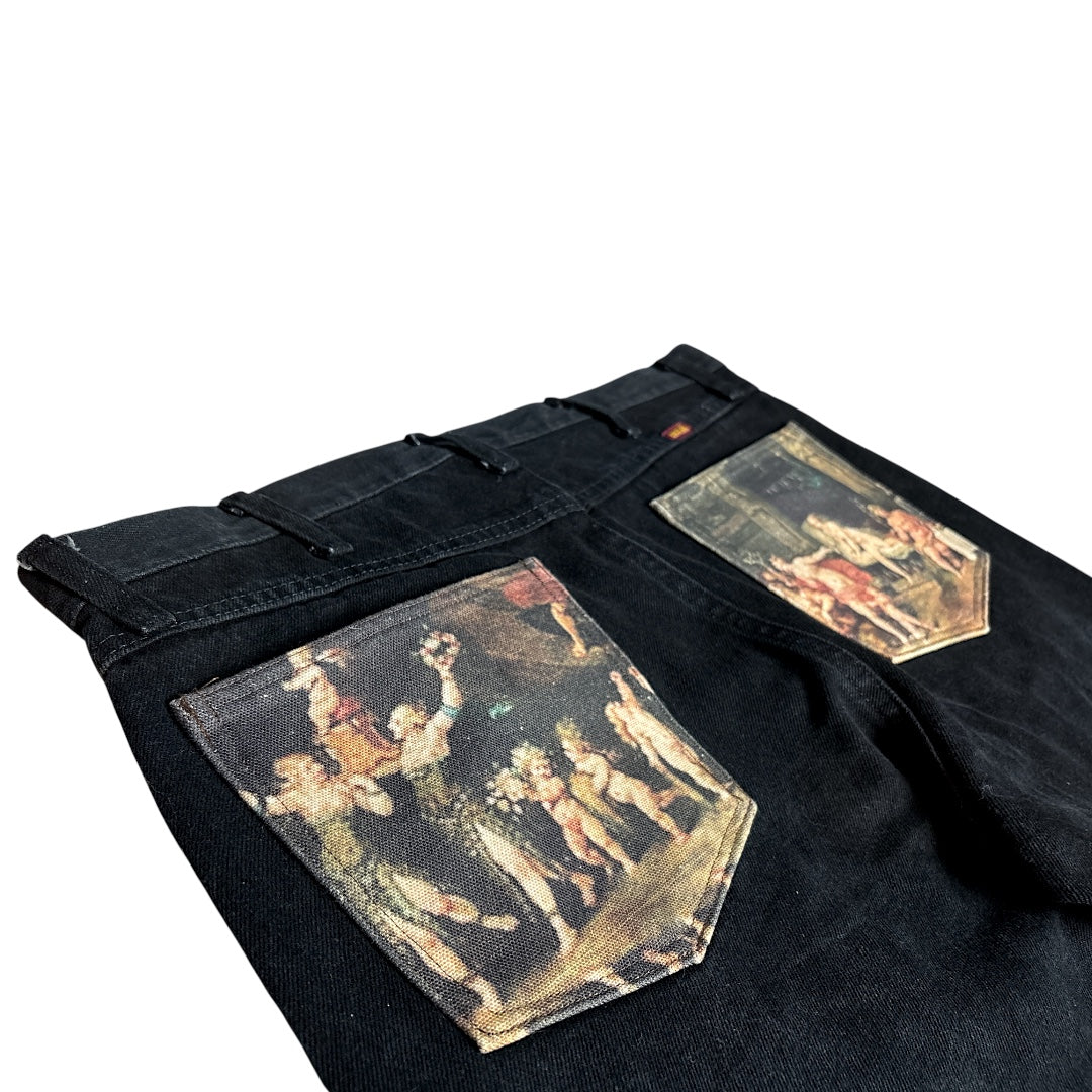 I transformed Hendrick Goltzius’ painting The Choice Between Virtue and Vice a piece about the choices we make and the life we live. Now stitched into a beautiful 1of1 pair of double-kneed jeans.